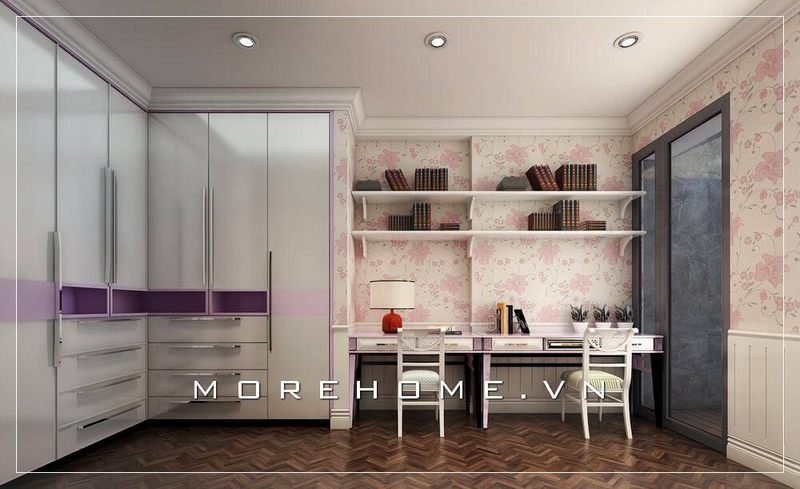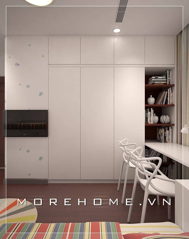 Tủ áo hiện đại kết hợp với kệ sách đang là xu hướng được nhiều khách hàng ưa chuộng. Màu trắng nhẹ nhàng sẽ tạo ra cảm giác tinh tế và ấn tượng hơn cho không gian phòng ngủ của trẻ em.